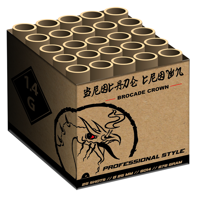 Brocade Crown 25 shots 25mm. Heerlijk sierlijk goud gecombineerd met heerlijk heldere flitsende blinkers geven in hun combinatie een prachtig geheel.