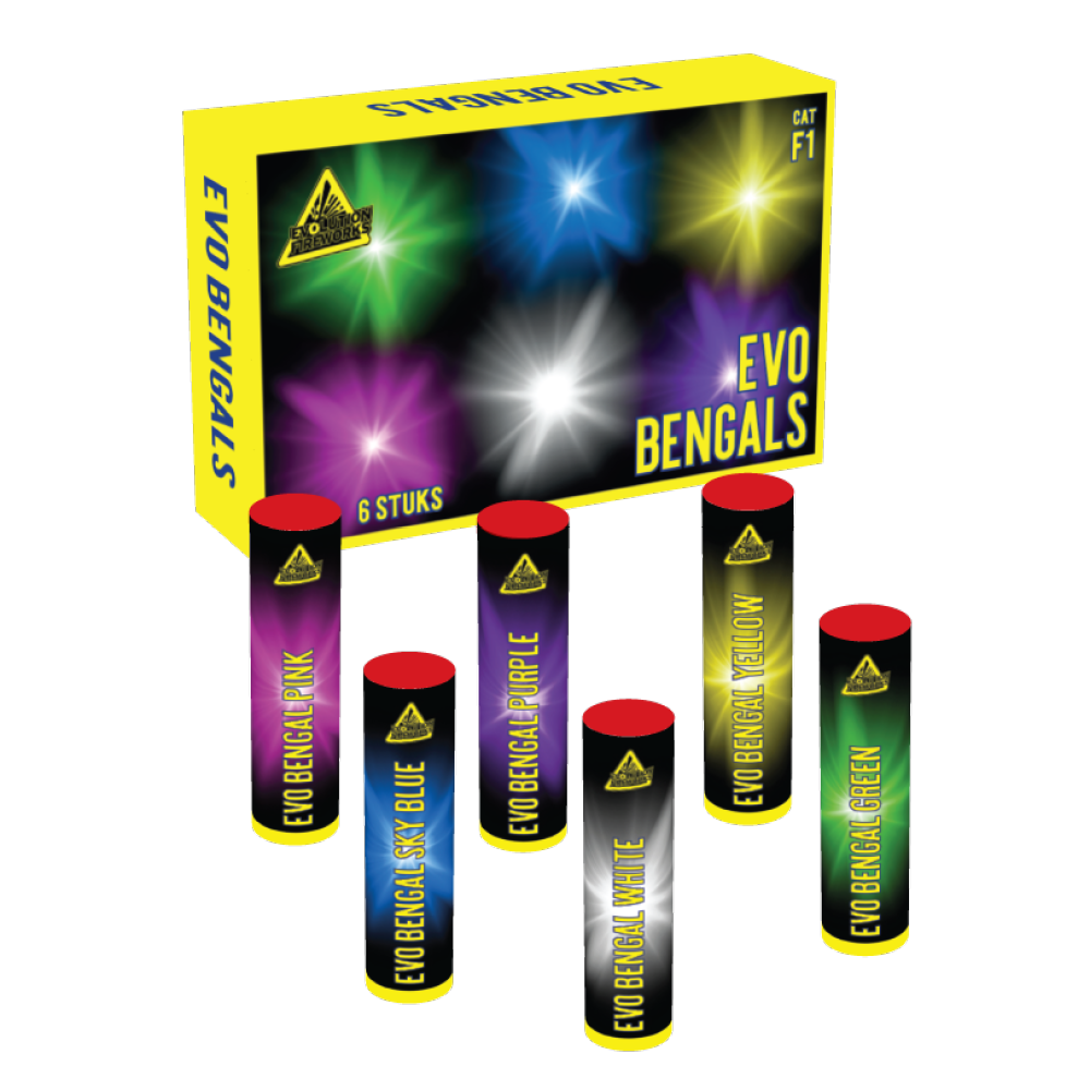 Doosje met 6 stuks EVO Bengals. Prachtige kleine Bengaalse lichten/fonteinen in de kleuren roze, blauw, paars, wit, geel en groen.